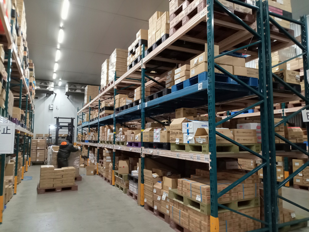 →届いた商品の検品や棚入れを行います。リーチフォークを使って、冷凍段ボールを効率よく格納していきます。