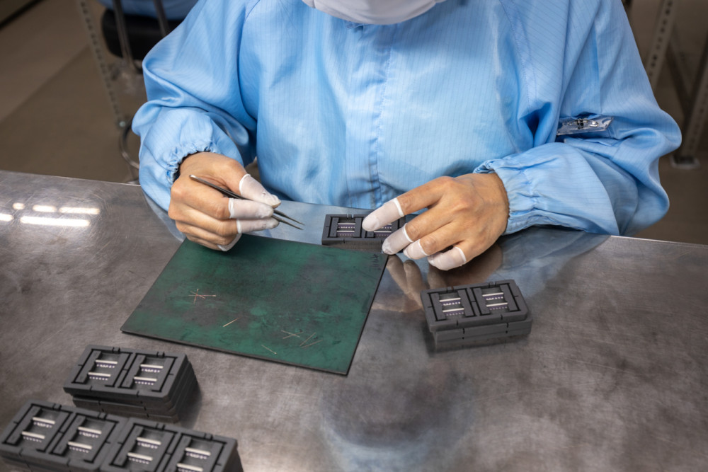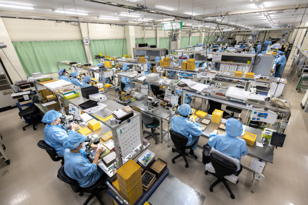 クリーンルームと呼ばれる空間が管理されたエリアで先輩スタッフに教わりながら